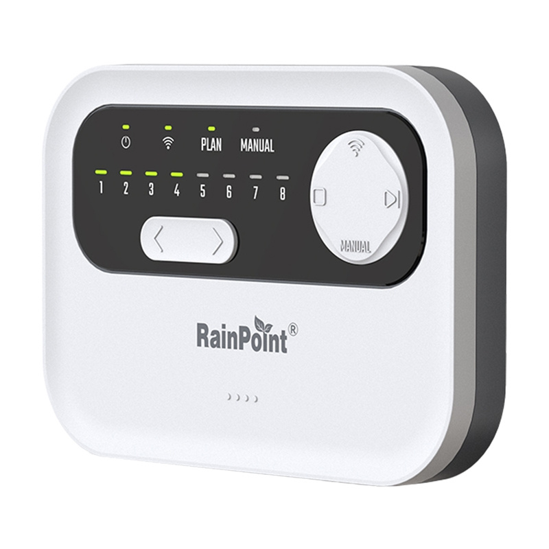 The RainPoint sprinkler controller is a complete solution for remote, smart irrigation. With direct Wi-Fi connectivity and the RainPoint Home app, you get complete control over eight zones and the master valve, with the ability to program up to eight separate watering schedules, a treatment calendar and rain delay, as well as automatic bypass cycles thanks to external soil moisture and rainfall sensors. The unit offers test buttons for quick connection verification, alarms when valves are disconnected, a multi-function power interface and intelligent adjustment of watering start times depending on the sequence of valves. Invest in precision, efficiency and peace of mind - choose RainPoint today!