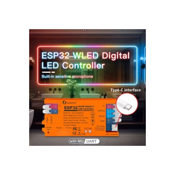 The Gledopto GL-C-016WL-D is an upgraded version of the GL-C-015WL-D IC LED strip controller. It comes with an integrated ESP32 chip and supports IC LED strips powered by 5V-24V DC. The new model retains a maximum output of 15A. With its built-in microphone and USB Type-C port, users can modify the firmware easily.