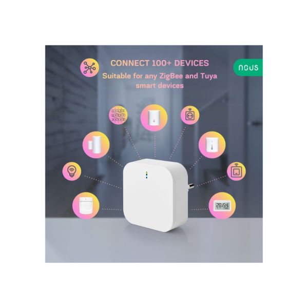 The Nous E1 is a Zigbee gateway equipped with both a Zigbee Tuya chip and a Wi-Fi chip, compatible with the Tuya/SmartLife smart home app. It is used to integrate devices equipped with a Tuya Zigbee chip (such as switches, sensors, relays, etc.) into the Tuya smart home system.