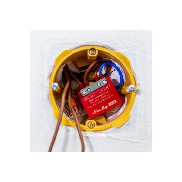 When installed behind existing wall switches, the Shelly 1PM Mini GEN4 enables remote control of your lighting or other connected appliances, while keeping manual switch operation fully functional. This makes it ideal for smart upgrades to existing electrical systems. It works well behind momentary or toggle switches, but due to its 8A current limit, it’s not recommended for outlet control.