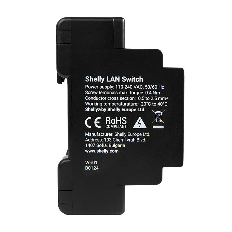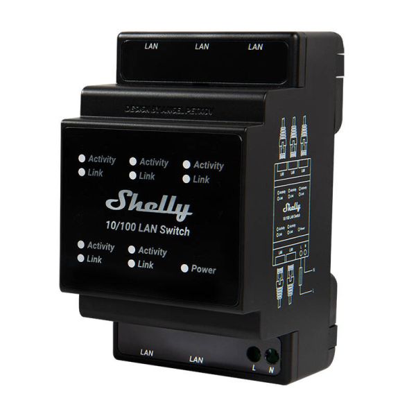 The Shelly LAN Ethernet Switch is designed to provide an efficient and stable network connection for a variety of devices. With five RJ45 ports, the device allows for seamless communication between multiple devices at the same time, which is crucial in modern homes and offices. Mounted on a DIN rail, the Shelly LAN Switch is the ideal solution for those who value order and efficiency in managing their network infrastructure.