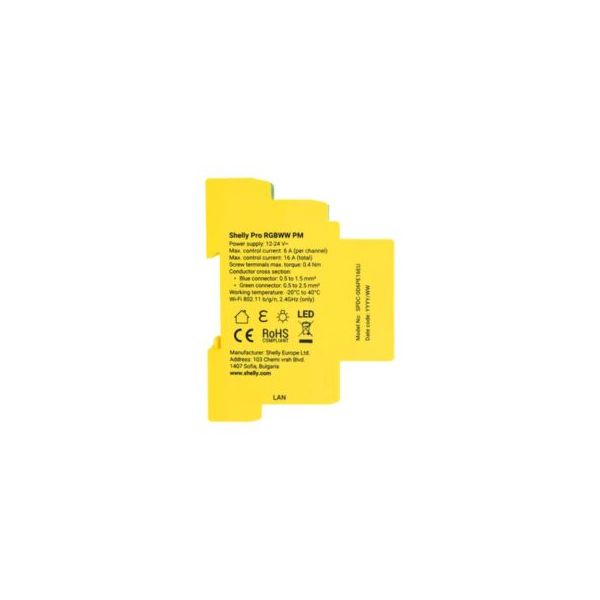 The Shelly Pro RGBWW PM is a professional, DIN-rail mountable, five-channel LED controller that offers an ideal solution for independently controlling RGB, RGBW, CCT, or even five separate single-color LED strips or lighting circuits powered by 12V–24V DC. The built-in power metering function enables real-time voltage, current, and power monitoring, allowing for not only visually appealing but also energy-efficient lighting solutions.