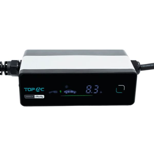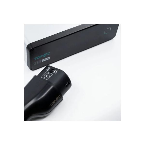 The TopAC protects both the vehicle and the electrical network with built-in electrical protections (overvoltage, overheating, short circuit, leakage current). The control box is rated IP65, and the cable features a Type 2 (EN62196) connector, making it compatible with most European electric cars. Total cable length is 5.6 m, with approximately 4.7 m on the vehicle side.