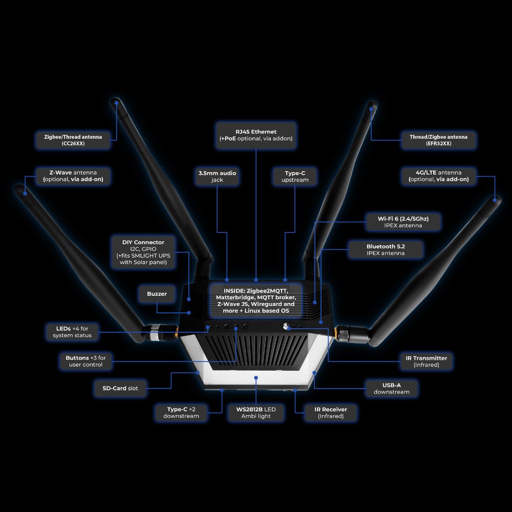 The SMHUB is a professional, Linux-based smart home controller by SMLIGHT, designed to provide stable and full-featured operation for locally hosted control software and automation platforms – all within a single, compact hub. The goal is to enable automation applications (e.g., Zigbee2MQTT, Node-RED, MQTT broker), manage multiple radio networks, and ensure cloud-independent local control from one device.