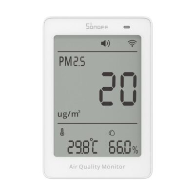 The SONOFF AirGuard PM2.5 & PM10 (SAWF-07P) is a Matter over Wi-Fi compatible air quality monitor that measures and displays real-time concentrations of PM2.5 and PM10 particulate matter. The device alerts users via visual signals and app notifications when levels exceed defined thresholds, helping to promote healthier indoor air quality through informed ventilation habits.